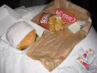 Carl’s Jr. began as a hot dog cart in the 1940s and since has grown into one of the biggest fast food chains in California. In 2000, Carl’s Jr was the first fast food restaurant to serve a sit down restaurant style burger, called “The 6 Dollar Burger” to their menu. On February 11th, 2009, in response to the Burger Conquest Twitter, Carl’s Jr. replies “CarlsJr @BurgerConquest If you’ve never had a Carl’s Jr. burger, try the Western Bacon Cheeseburger, a classic; also the original Six Dollar Burger ” On February 12th, after an evening of celebration with friends, we stop at a Carl’s Jr. Jr. (a smaller version of the restaurant that is drive-thru only) to do as we were told.