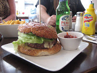 The Ultimate Burger serves prime Scottish, grass-fed beef. I am not sure what the U.S. equivalent would be, but sounded good enough to me. With quite a unique menu that includes aubergine (read: Eggplant), lamb and chicken burgers, it took a moment to decide. With all these crazy choices, I still went with a classic with monterey jack cheese cooked medium rare. While we waited for the burgers to arrive we all had a giggle over the tomato shaped ketchup dispenser.