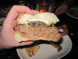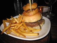With five burger sandwich choices offered, I still had no trouble choosing the Puebla burger made with roasted chili & red onion relish, queso fresco. Let me start of by saying, this might be the juiciest burger I’ve ever had and that’s NOT in anyway to imply it was greasy. This da juice mon!!! Clearly made from a blend of fresh ground beef with a slightly higher fat content than the standard 80/20 mix you’ll find at most places. The green chiles are not as smoky as I’m used too and almost sweet to taste. Damn they are nice. The VERY creamy and mild cheese acts like a scout master calling the troops to the fire, which in this case is the beef! I’m guessing its a Chef Capon specialty to top his burgers with heavily breaded and super rad onion rings. It’s like a deep fried loaf of bread made out of pancake batter surrounding a fresh onion.